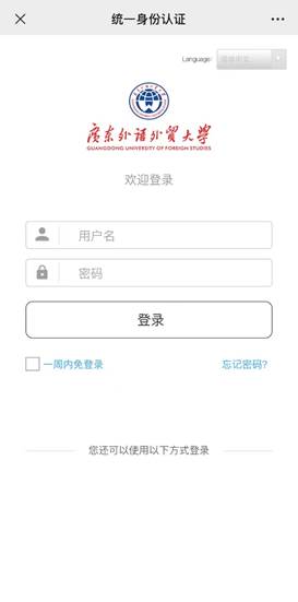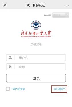 第1步:在移动端访问登录智慧广外(统一身份认证平台)的登录页面,点击按钮“忘记密码?”,如下图所示: