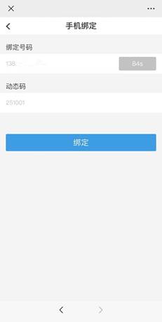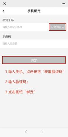 第3步:点击“手机绑定”跳转手机绑定的详情页面:输入手机号获取验证码、输入短信验证码、点击按钮“绑定”(注意:在输入了手机号后按钮“获取验证码”才会变为彩色(蓝色)状态;输入了验证码之后按钮“绑定”才会变为彩色(蓝色)状态)。如下图所示