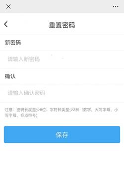 第3步:点击按钮“下一步”后跳转到密码设置界面,注意系统对密码的要求,输入新的密码,点击按钮“保存”。如下图所示: