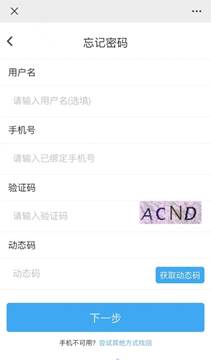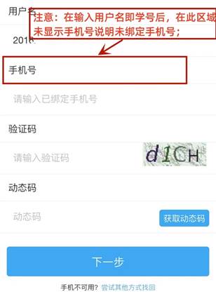 输入学号、手机号(输入已绑定手机号)和图片验证码,获取动态码,及最后点击按钮“下一步”。