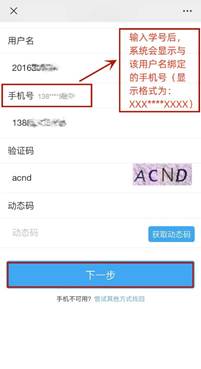 注意:输入了用户名即学号后系统会显示与之绑定的手机号(手机号信息未全部显示,手机号显示格式为XXX****XXXX)。